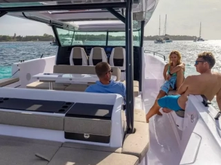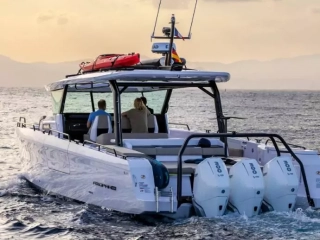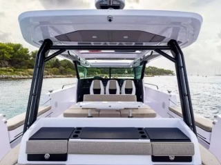 The Axopar 45 Cross Top is a hybrid between the Sun Top and Cross Cabin models, with a selection of the best properties of open and enclosed boating. Its negative-angle wraparound windshield protects against wind, rain, and glare while offering all-around visibility and improved navigation capabilities - an ultimate choice for professionals and seasoned adventurers.