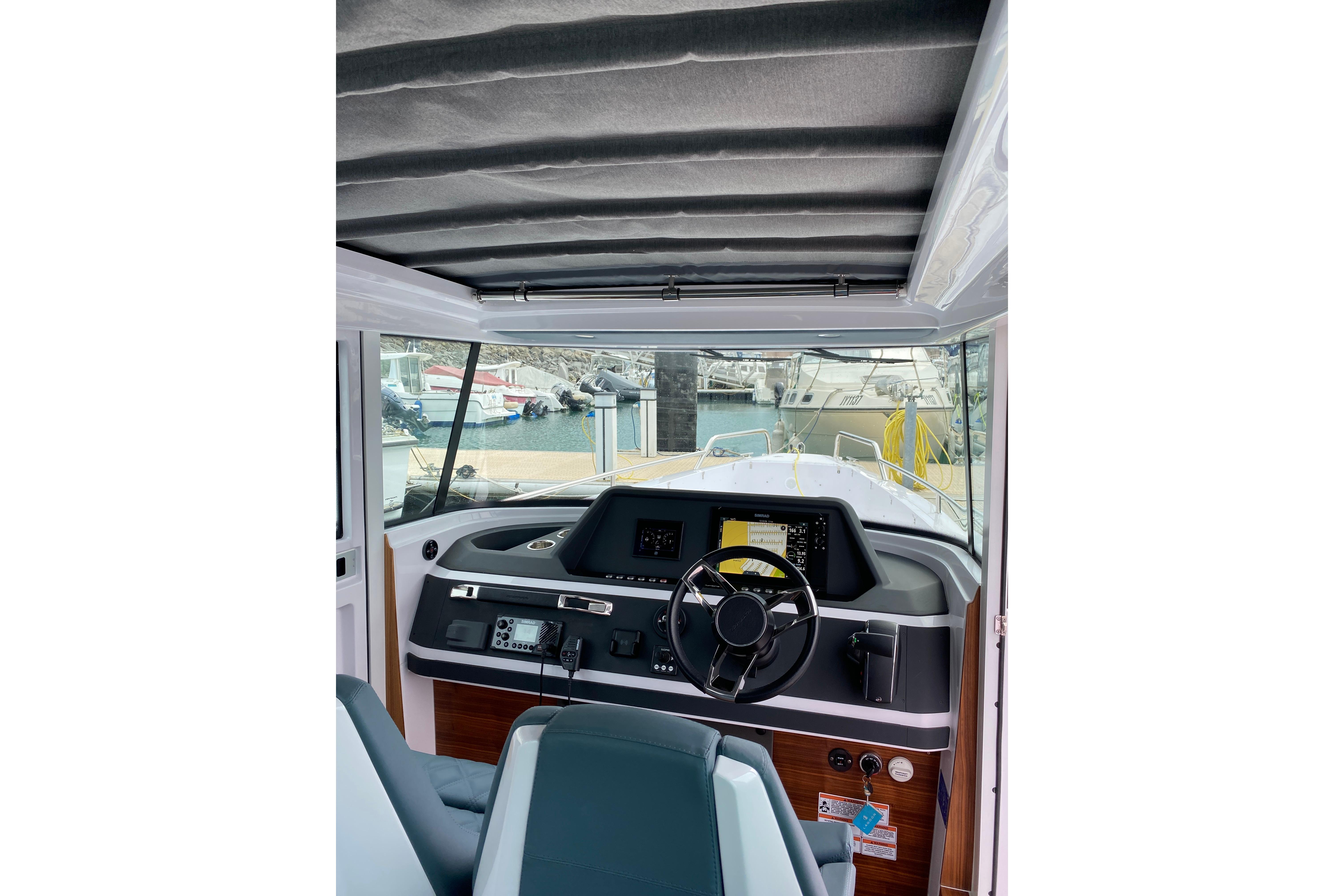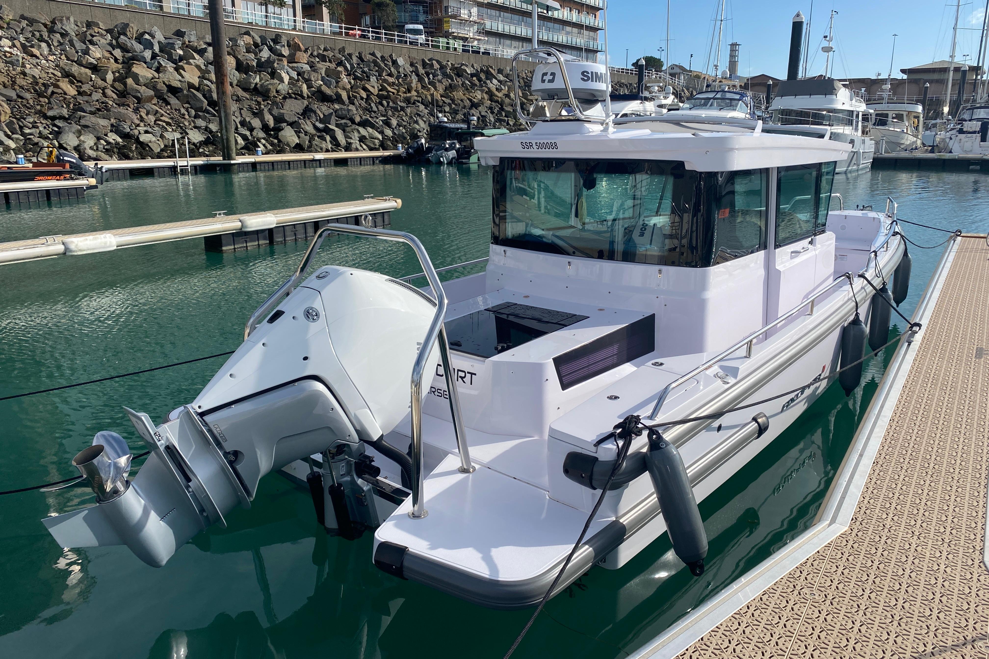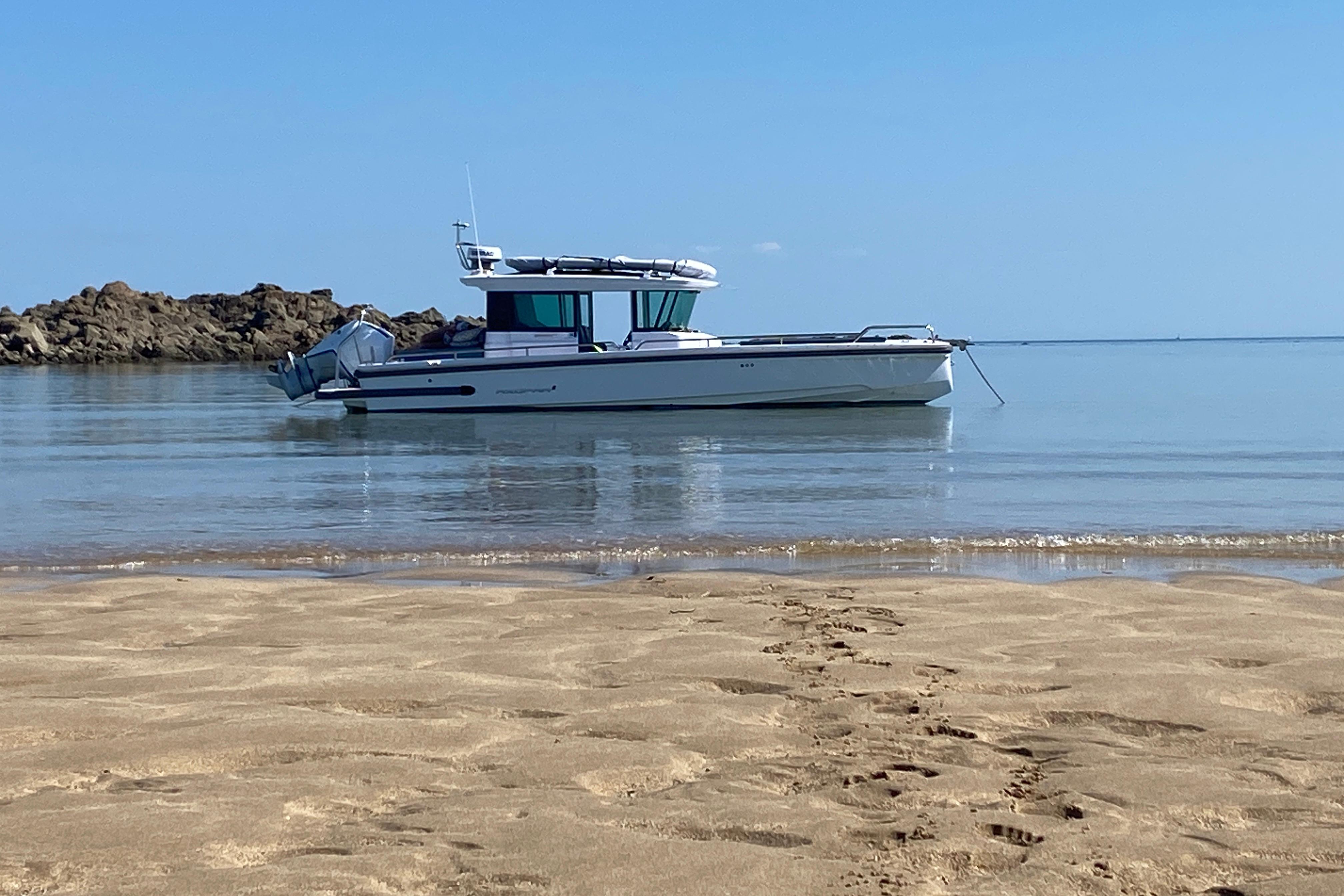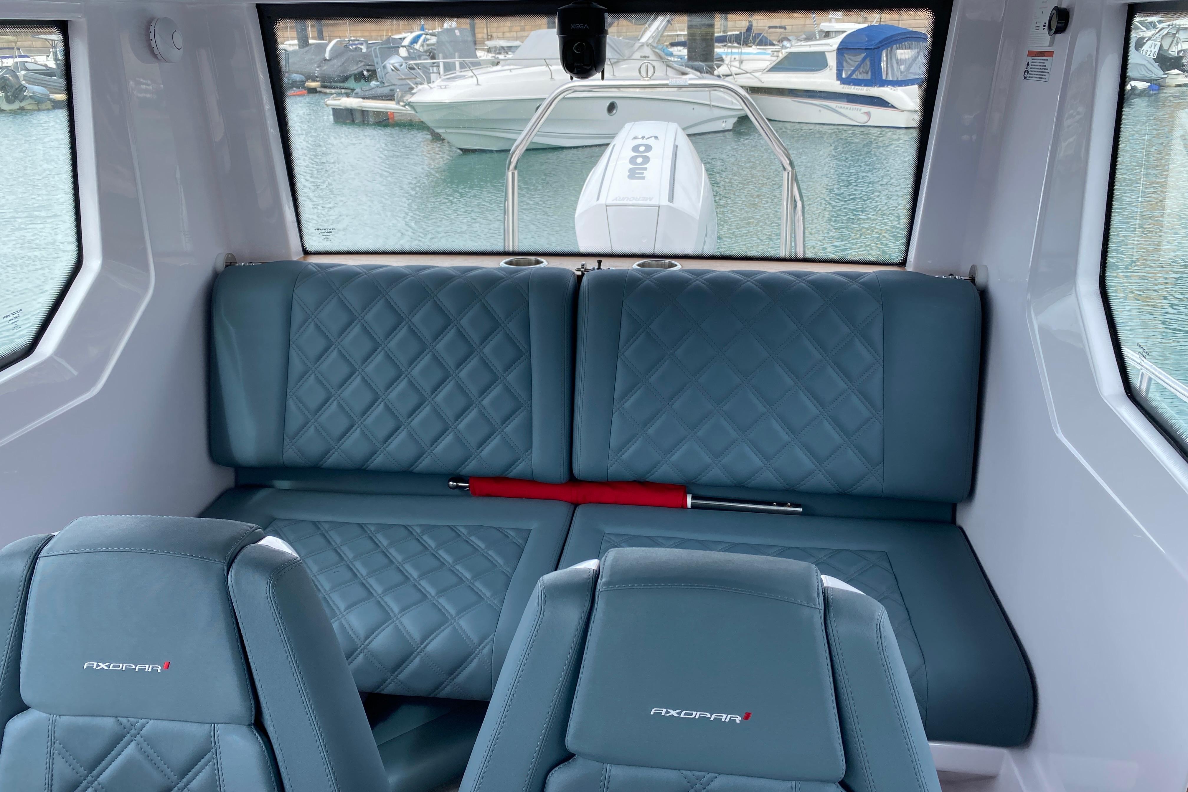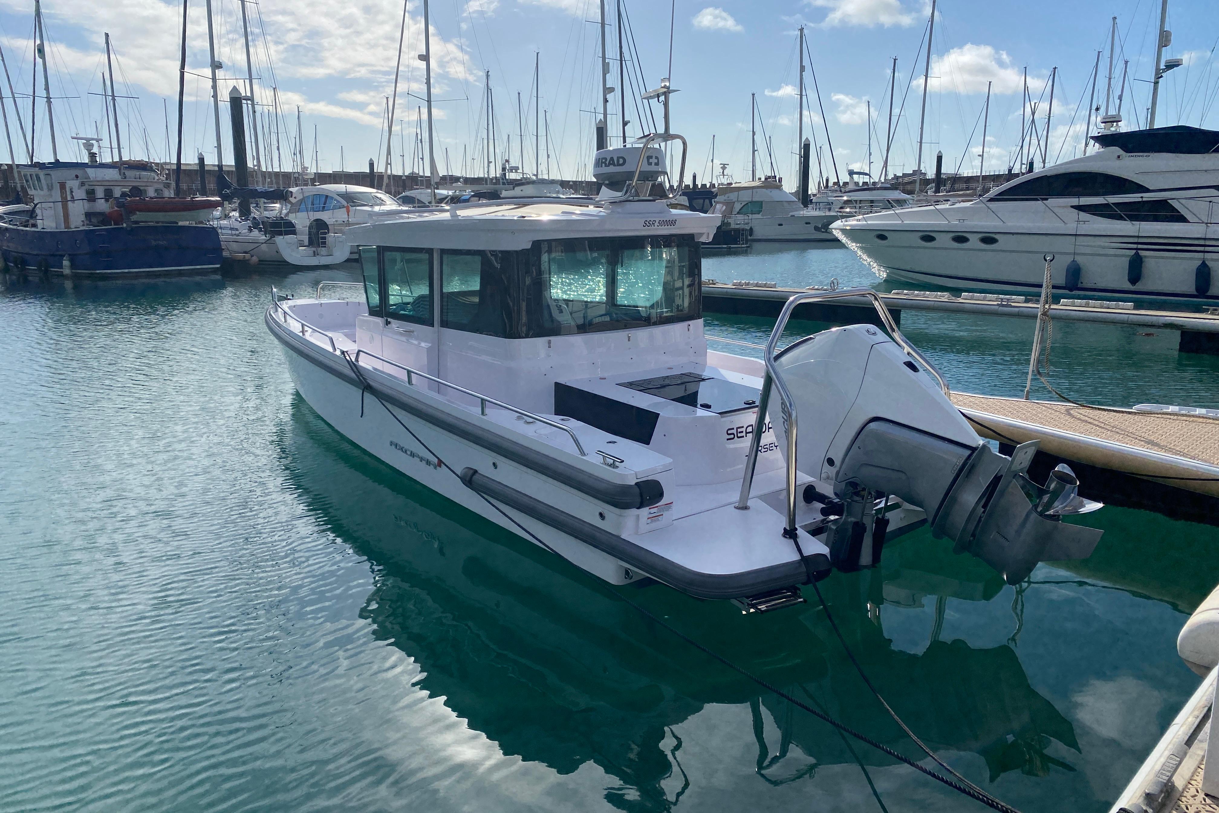 This Axopar 28 Cabin with a Mercury V8 outboard is a sporty, versatile 28-foot multifunctional boat featuring a protected, bright cabin with large sliding doors and sunroof, adaptable interior seating that can convert to berths allowing for 4 berths. Paired with a 300 hp Mercury Verado V8 outboard, it delivers brisk performance with top speeds, efficient cruising, excellent sea-keeping thanks to its twin-stepped deep-V hull, and comfortable all-weather usability for family cruising, watersports, fishing or coastal adventures. This boat can be viewed exclusively through Quay Boats, Channel Islands and comes with a FULL SERVICE HISTORY