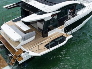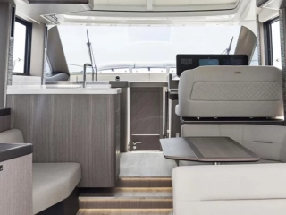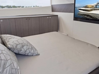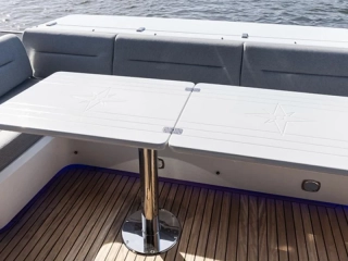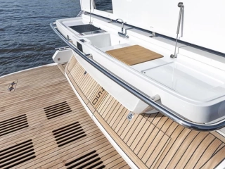 Twin Volvo Penta 2 x IPS-650 (including joystick) with digital 7" display • Three cabins and two bathrooms to accommodate 6 guests • Rotating aft sofa • Drop-down balconies • Full beam master cabin • Air-conditioning • Bowthruster • Raymarine navigation equipment • Fischer Panda generator • Hydraulic bathing platform • Permateek on bathing platform, cockpit deck and balconies • Wetbar with electric grill on bathing platform • LED ambient lighting • Fusion sound system