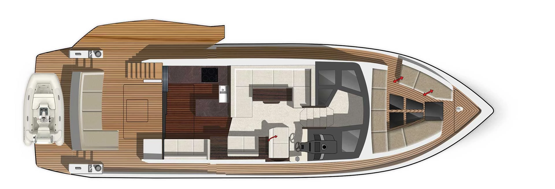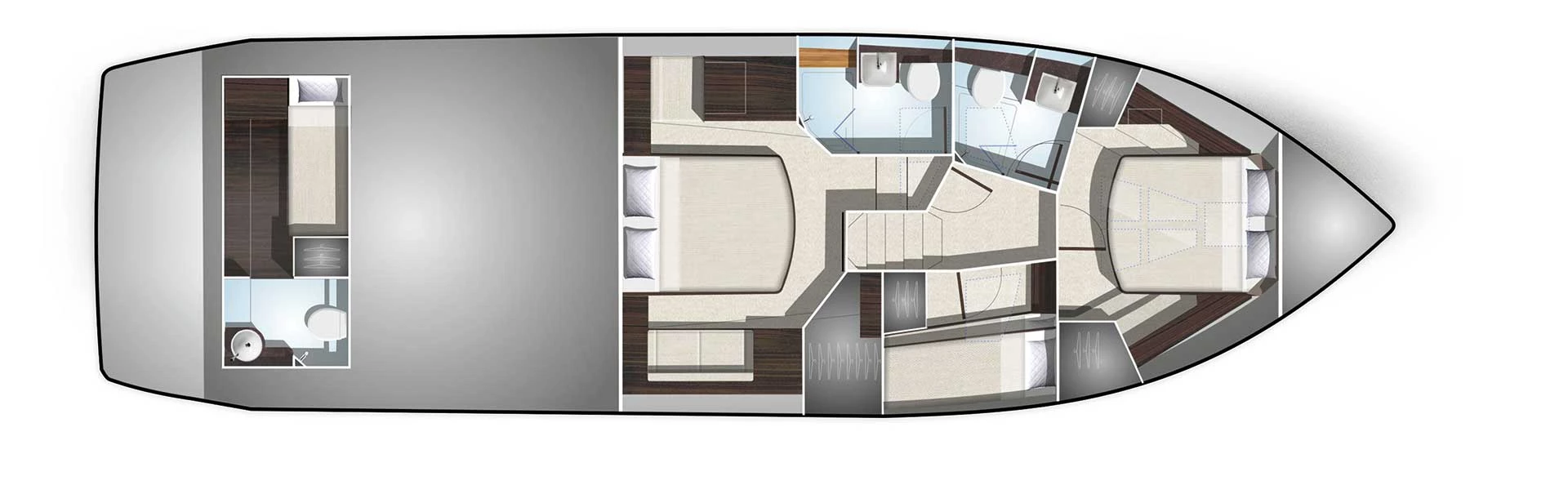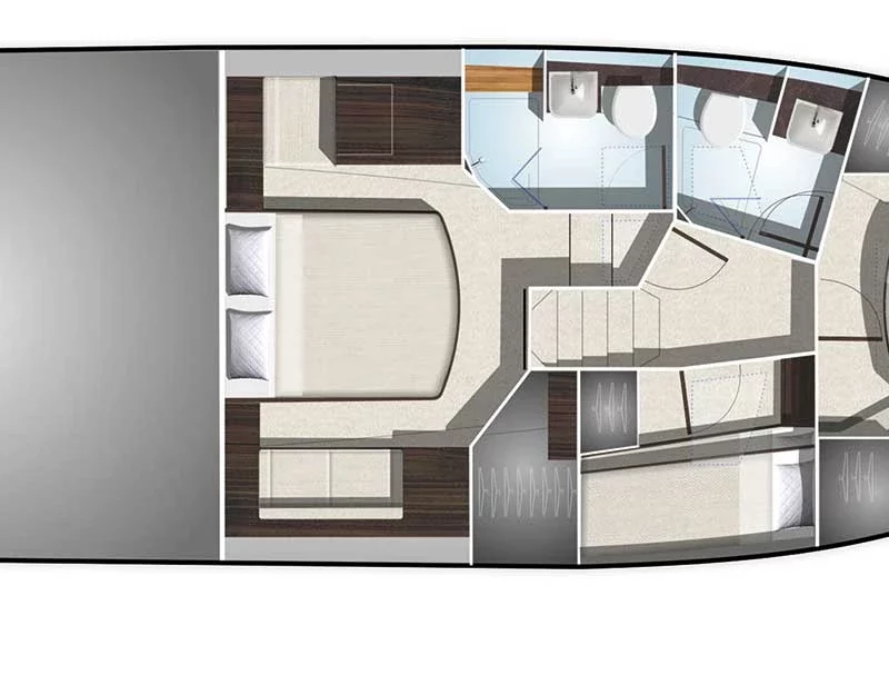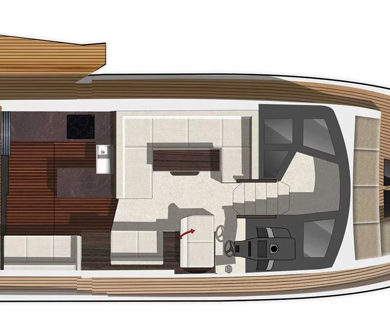The 510 is fitted with a spectacular glass sunroof over the helm station as well as a top deck with sundecks and extra steering that can be covered with a soft roof when necessary.LAYOUT
