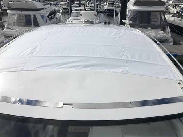 Hard top version with electric opening sunroof • Electric drop window at helm position • Tender garage with electro-hydraulic powered door • High capacity air compressor for rapid inflation of tender • Electro-hydraulic telescopic passerelle • Transom platform with electro-hydraulic lift mechanism • Teak laid transom platform, cockpit and steps to side decks • Cockpit wetbar with sink, electric BBQ and top loading cool box • Cockpit sunbed and cushions • Remote control electric anchor winch • Self stowing Delta anchor with 50m anchor chain • Hot and cold transom shower • Grey Sunbrella canvas covers