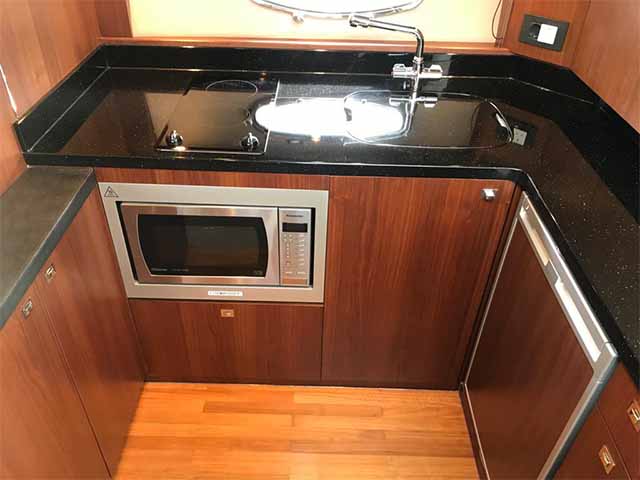Below deck the saloon and galley are substantial for her size and equipped with a high level of standard equipment. The U–shaped dinette can also convert into a double berth for additional overnight guests.